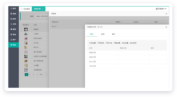 訂單人員、庫管人員、財(cái)務(wù)人員,系統(tǒng)權(quán)限都不同,業(yè)務(wù)人員管轄的客戶也相互獨(dú)立;不同層級(jí)客戶可以設(shè)置等級(jí)價(jià),不同客戶區(qū)域也可設(shè)置區(qū)域價(jià),也可以單獨(dú)為某個(gè)客戶設(shè)置價(jià)格,同種商品,不同規(guī)格價(jià)格也可不同!